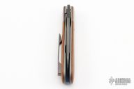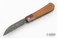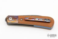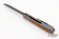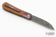 This Swayback Front Flipper by Enrique Pena features a Damascus blade with a notched thumbrest and front flipper. The handle has Mokuti bolsters, natural canvas micarta scales, bead blasted titanium liners, anodized titanium backspace, tip up mokuti clip. Includes padded zippered case. New from maker at the 2023 Blade Show Texas.