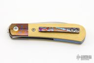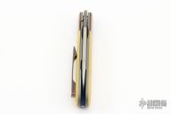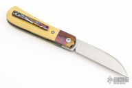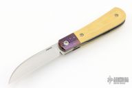 This Swayback Front Flipper by Enrique Pena features a hand rub satin finished blade with a notched thumbrest and front flipper. The handle has Mokuti bolsters, natural canvas micarta scales, bead blasted titanium liners, anodized titanium backspace, tip up mokuti clip. Includes padded zippered case. New from maker at the 2023 Blade Show Texas.