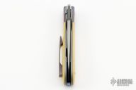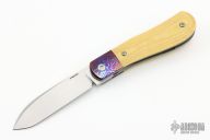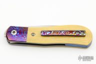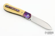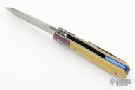 This Dogleg Front Flipper by Enrique Pena features a hand rub satin finished drop point blade with a notched thumbrest and front flipper. The handle has Mokuti bolsters, yellow paper micarta scales, blasted titanium liners, anodized titanium backspacer, tip up mokuti clip. Includes padded zippered case. New from maker at the 2023 Blade Show Texas.