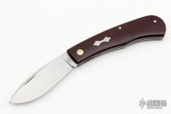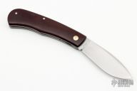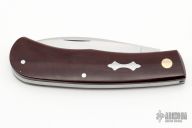 This slipjoint by Matt Collum features a hand rub satin finished blade with nail nick. The handle has vintage Westinghouse maroon linen micarta covers, bronze/stainless steel pivot, stainless steel liners and spring. Stainless steel shield. Has half-stop, flush in all positions. Comes with a zippered case. New from maker at the 2023 Blade Show Texas. These are as nicely done and as clean as any!