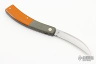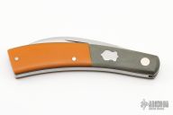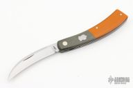 This slipjoint by Matt Collum features a hand rub satin finished blade with nail nick. The handle has vintage Westinghouse XX OD Green paper micarta bolsters, vintage Westinghouse xxx orange paper micarta covers, vintage WWII era brown canvas micarta liners made from a .50 Cal blister gun box, nickel silver/stainless steel pivot, stainless steel liners and spring. stainless steel shield. Has half-stop, flush in all positions. Comes with a zippered case. New from maker at the 2023 Blade Show Texas. These are as nicely done and as clean as any!
