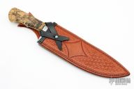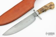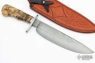 This Bowie by Journeyman Smith Heath Bartholomew features a hand rub satin finished blade with hamon, nearly sharpened top edge, .248" blade stock and 1.79" blade depth, hidden tang construction. The handle has stainless fluted steel guard, fluted stainless collar, wood grip, and a single pin. Comes with a hand-tooled brown leather sheath in the style of Paul Long. New from maker at the 2023 Blade Show Texas.