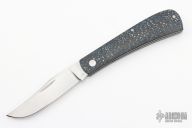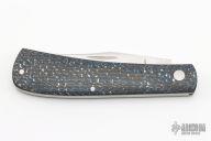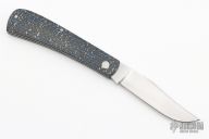 This Trapper by Ryan Minchew features a hand rub satin finished clip point blade with nail nick. The handle has electric blue carbon fiber covers and a stainless steel liners and spring. Has a half-stop, flush in all positions. Comes with a zippered case. New from maker at the 2023 Blade Show Texas.