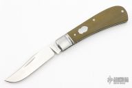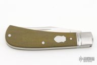 This Trapper by Ryan Minchew features a hand rub satin finished clip point blade with nail nick. The handle has fluted stainless steel bolsters, green canvas micarta covers, stainless steel escutcheon, stainless steel liners and spring. Has a half-stop, flush in all positions. Comes with a zippered case. New from maker at the 2023 Blade Show Texas.