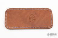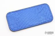 This leather slip sheath by Robertson Leather Works features hand dyed alligator skin. It is 4.75" long by 2.25" wide. New from maker at the 2023 Blade Show Texas.