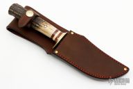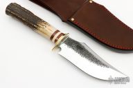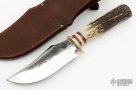 This Hunter by Rocco Handmade features a satin finished hollow ground blade with hammer marked flats, .235" blade stock and 1.8" blade depth, hidden tang construction. The handle features a brass guard, red/micarta/aluminum spacers, and a stag grip with brass pin. Great look and feel. Comes with a Treeman brown leather sheath. New from maker at the 2023 Texas Blade Show!