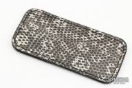 This leather slip sheath by Robertson Leather Works features ring lizard skin. It is 4.75" long by 2.25" wide. New from maker at the 2023 Blade Show Texas.
