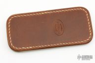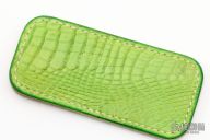 This leather slip sheath by Robertson Leather Works features hand dyed alligator skin. It is 4.25" long by 2" wide. New from maker at the 2023 Blade Show Texas.