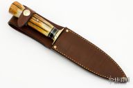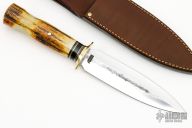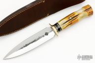 This Dagger by Rocco Handmade features a satin finished hollow ground blade with hammer marked flats, .178" blade stock and 1.344" blade depth, hidden tang construction. The handle features a brass guard, yellow/micarta/brass/blue spacers, and a stag grip with brass pin. Great look and feel. Comes with a Treeman brown leather sheath. New from maker at the 2023 Texas Blade Show!