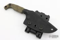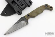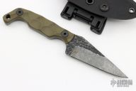 This Mini by Stroup Knives features a dark tumbled drop point blade with sculpted flats and a full tang construction.  .172" Blade Stock.  1.096" Blade Depth.  The handle features sculpted G10 scales.  Includes a kydex sheath with a Tek-Lok.  Includes the original box.  New from Maker!
