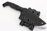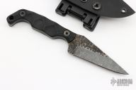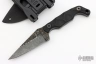 This Mini by Stroup Knives features a dark tumbled drop point blade with sculpted flats and a full tang construction.  .164" Blade Stock.  1.095" Blade Depth.  The handle features sculpted G10 scales.  Includes a kydex sheath with a Tek-Lok. New from maker!