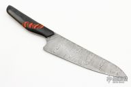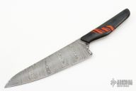 This Chef's Knife by Broken Anvil Knife Works features a Damascus blade with textured spine, .078" blade stock and 1.787" blade depth, full tang construction. The handle has black canvas micarta scales with micarta bands in the middle, natural canvas micarta liners. Comes with a zippered case and makers card. New from maker at the 2023 Blade Show Texas.