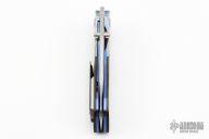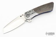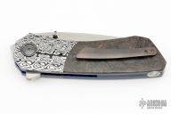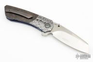 This HB21 linerlock flipper by Herucus Blomerus features a hand rub satin finished blade with polished flats and flipper. The handle has Gysinge pattern Damasteel bolsters, Dark Matter carbon fiber scales with anodized titanium liners, Dark Matter Carbon Fiber backspacer and a tip up anodized titanium clip. Comes with velcro case and COA. New from maker at the 2023 Blade Show Texas. This knife can be opened three different ways, thumbstuds, flipper and front flipper.