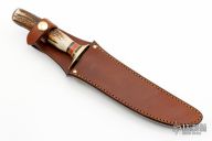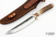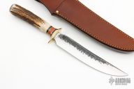 This Fighter by Jim Behring features a hammer finished upswept hollow ground blade with false top edge, .185" blade stock and 1.209" blade depth, hidden tang construction. The handle features a brass guard, black/red/yellow/blue spacer pattern, pinned premium sambar stag. Great look and feel. Comes with full stitch brown leather sheath. New from maker.