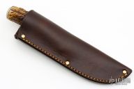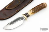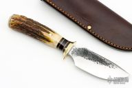This Skinner by Jim Behring features a satin finished and hammer marked hollow ground blade with a false top edge, .187" blade thickness and 1.30" blade depth, hidden tang construction. The handle has a brass guard and musk ox cap, pinned vintage 100+ year old Sambar stag grip, black/red/micarta spacer pattern. Great look and feel. Comes with brown leather sheath. New from maker!