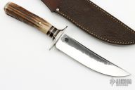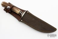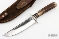 This Skull Fighter by Jim Behring features a satin finished hollow ground blade with hammer marked flats, .246" blade stock and 1.354" blade depth, hidden tang construction. The handle features a nickel silver guard, black/brass/red/aluminum/yellow spacer pattern, and a stag grip with a nickel silver pin and butt. Comes with brown leather sheath with shark skin overlay. New from Maker at the 2023 Blade Show Texas! Comes with a zippered case.