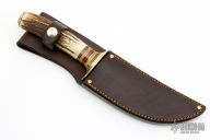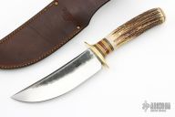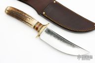 This Big 6 by Jim Behring features a satin finished hollow ground blade with hammer marked flats, .237" blade stock and 1.612" blade depth, hidden tang construction. The handle features a brass guard, black/yellow/brass/yellow linen micarta/red/natural canvas micarta spacer pattern, and a stag grip with a brass pin and butt. Comes with brown leather sheath. New from Maker at the 2023 Blade Show Texas!