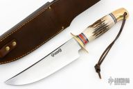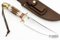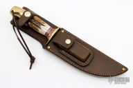 This Fighter by Jim Behring features a satin finished convex ground blade with .187" blade stock and 1.672" blade depth, hidden tang construction. The handle features a brass guard, black/brass/blue/white/red spacer pattern, and a stag grip with a brass butt with lanyard hole. Comes with brown leather sheath with sharpening stone. New from Maker at the 2023 Blade Show Texas!