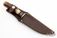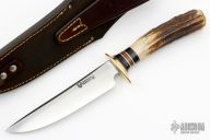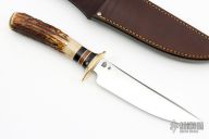 This Double Skull Fighter by Jim Behring features a satin finished convex ground blade with .159" blade stock and 1.249" blade depth, hidden tang construction. The handle features a brass guard, black/yellow/aluminum/red spacer pattern, and a stag grip with a brass pin and butt. Comes with brown leather sheath. New from Maker at the 2023 Blade Show Texas!