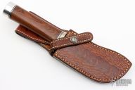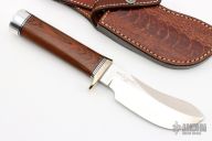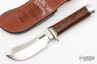 This Rick Bowles skinner by Randall has a satin finished blade with false top edge, .234" blade stock and 1.656" blade depth, notched thumbrest, hidden tang construction. The knife carries the small Randall logo stamp and the backside is etched with "Bowles Skinner 134". The handle has a nickel silver guard, cocobolo grip, duralumin butt, and black/duralumin spacers. Comes with brown leather sheath with an Ostrich leg skin overlay signed/dated on back by Rick 2007. Excellent condition. Comes with a Randall Knives zippered case, original papers and sharpening stone.