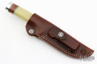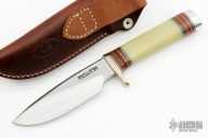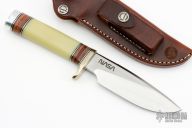 The Model 25-5 by Randall Made Knives is a drop point hunter similar to Model 11, but handle construction is reminiscent of 1930′s design. Excellent skinning, outdoors knife. This knife has a stainless steel blade with notched thumbrest, .225" blade stock and 1.364" blade depth, hidden tang construction. The handle brass guard and duralumin pommel, NASA G-10 grip with stacked leather, black and duralumin spacers. Comes with brown leather sheath with NASA Meatball logo. Comes with a Randall Knives zippered case, original papers, and a COA dated August 5th, 2020 stating that this knife is ONE OF ONE. Excellent condition.