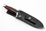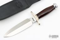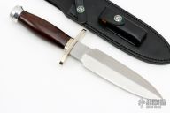 This Tom Clinton Special by Randall Made Knives has a double-edged stainless steel satin finished blade, 236" blade stock and 1.597" blade depth, hidden tang construction. The handle has a forward curved nickel silver guard, cocobolo grip with a duralumin butt, black spacers. Comes with a black leather sheath. Excellent condition. Comes with a Randall zippered case and papers