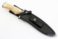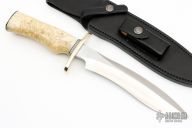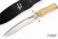 This Small Sasquatch by Randall Made Knives features a satin finished recurve blade with sharpened top edge, .231" blade stock and 1.368" blade depth, hidden tang construction. The handle has a forward curved nickel silver double guard, nickel silver butt, and a massive musk ox handle with black/duralumin spacers. Comes with a black leather sheath, Randall Knives zippered case and papers. Excellent condition.