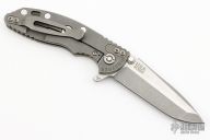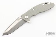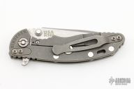 This 3" Spanto XM-18 Gen4 flipper from Hinderer Knives has a two-tone working finished blade with notched thumbrest and flipper, no choil. Grey G-10 scale and a working finished titanium frame and pocket clip. Reversible pocket clip. Strong lock up, nice detent and blade seating is center. Includes original box, extra bushings and papers. Has some scuffs, otherwise excellent condition.