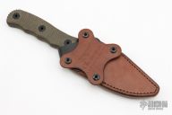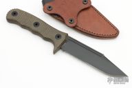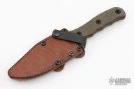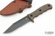 This Binome by Bastinelli Creations features a black drop point blade with partial serrations, fullers and a mortis tang construction.  .157" Blade Stock.  1.276" Blade Depth.  The handle features a green micarta grip.   Includes a brown leather sheath and a padded zippered case.  New from Maker.