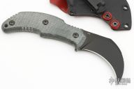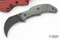 This Primal by Bastinelli Knives features a black hawkbill blade with a mortis tang construction.  .136" Blade Stock.  1.145" Blade Depth.  The handle has green micarta scales.  Includes a kydex sheath with a padded zippered case.  New from Maker!