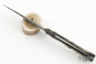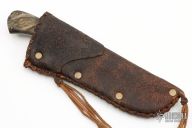 This knife by Bannok Knives was created in the style of a Custom Winkler knife. It is well done! It features a hand rub satin finished blade with hamon and fileworked spine, .193" blade stock and 1.302" blade depth, full tapered tang construction. Copper wrapped bolster with sinew wrap, cape buffalo horn scales with brass pins. Comes with a brown leather sheath with brass rivets. Excelletn condition.