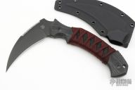 The Grumpy from Bastinelli Creations features a black hawkbill blade with a mortis tang construction.  .121" Blade Stock.  1.43" Blade Depth.  The handle features black micarta scales and custom wrap.  Includes a kydex sheath, and a padded zippered case.  New from maker!