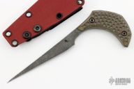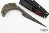 This Gambler by Bastinelli Creations features a heavy tumbled blade with a full tang construction and notched thumbrest.  .189" Blade Stock.  0.626" Blade Depth.  The handle has green micarta scales.  Includes a black kydex sheath with a padded zippered case. New from maker!