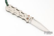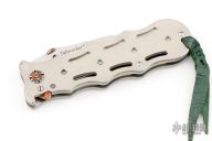 This Taliwacker Bullfrog by Ron Lake is #1 of 15. It features a hand rub satin finished blade with false top edge and thumbdisc. The handle has a satin finished titanium frame with safety lever on the spine, inlaid liner. Comes with a zippered case. Has a couple extremely light scuffs, otherwise excellent condition.
