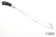 This Indonesian Parang features a hand forged blade with a hand rub satin finish, .165" blade stock and 2.031" blade depth, hidden tang construction. The handle has a steel ferrull and a hand carved buffalo horn grip with a skull carving on the butt. Comes with a zippered case. Has a few light scratches, otherwise excellent condition.