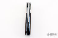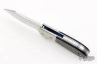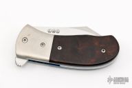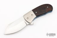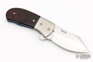 This Small Puffin flipper from Chuck Gedraitis features a clip point satin finished blade with flipper. The handle has satin finished titanium bolsters, desert ironwood burl scales, anodized titanium liners and a satin finished titanium backspacer. Comes with a nylon zippered case. Has some light scuffs/scratches.  This knife would make a good user.