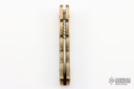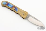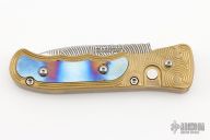 This Side opening automatic by Rob Dalton features a satin finished blade with file worked thumbrest and a brass frame with anodized titanium overlays. Nice lockup, action and blade seating. Excellent condition.
