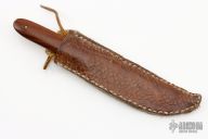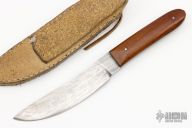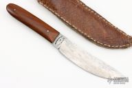 This knife by Master Smith Bill Bagwell features a Cable Damascus blade with .216" blade stock at the ricasso and 1.154" blade depth, full tapered tang construction. The handle has wood scales. Includes a brown leather sheath and zippered case. Has some scratches, has been resharpened, otherwise good condition.