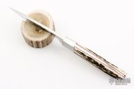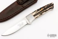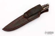 This knife by Robert Crowder features a mirror polished blade with .137" blade stock and .838" blade depth, full tapered tang construction. The handle has dovetailed stainless steel bolsters and sanbar stag scales with red liners. Comes with a brown leather sheath.  Excellent Condition.