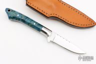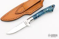 This Bird and Trout by Mike Zima features a mirror polished dropoint blade with a fileworked spine and full tang construction.  .064" Blade Stock.  .618" Blade Depth. The handle features steal bolsters and boxelder burl scales.  Includes a padded zippered case.  Excellent Condition.