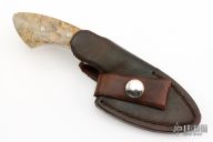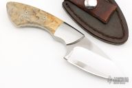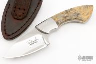 This knife by Robert Crowder features a mirror polished blade with .139" blade stock and 1.646" blade depth, full tapered tang construction. The handle has dovetailed stainless steel bolsters and boxelder burl wood scales. Comes with a brown leather sheath.  Excellent Condition.