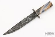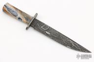 This miniature Fighter by Dan Westlind a Damascus clip point blade with a hidden tang construction.  .091" Blade Stock.  .434" Blade Depth. The handle has a Damascus guard and a mammoth molar guard.  Excellent Condition.  This is a pretty cool little knife.
