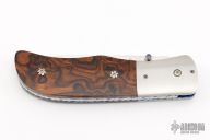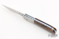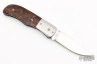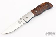 This linerlock folder from Doc Hagan features a satin finished drop point blade with a fileworked blade spine with a single nail nick.  The handle features steel bolsters, ironwood burl scales over fileworked anodized titanium liners.  Includes a padded zippered case.  Excellent Condition.