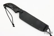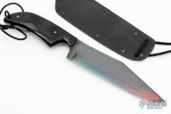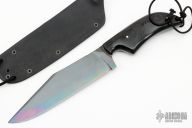 This Military Bowie by Fred Perrin features a black clip point blade with swedge and notched thumbrest, visible temper line, .150" blade stock and 1.594" blade depth, full tang construction. The handle is comprised of contoured black linen micarta scales with nickel silver pins and lanyard hole. Includes kydex sheath. New from maker.