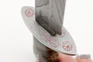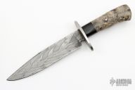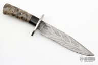 This Bowie by ABS Apprentice Randy Caston features a 100 piece Damascus (1084 and 15N20) blade with false top edge, .170" blade stock and 1.495" blade depth, hidden tang construction. The handle has an engraved stainless steel guard, stabilized buckeye burl wood grip with a dark rosewood spacer. Comes with a zippered case. New from maker at the 2023 Blade Show Texas.