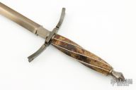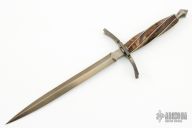 This Renaissance Dagger by Marko Zagar features a hot blued OC100 steel blade with .344" blade stock and .735" blade depth, hidden tang construction. The handle has a hot blued guard and butt with Damascus spacers, lime burl wood handle that has been spiral fluted and inlaid with twisted silver wire. Comes with a wooden presentation box and COA dated September 2022. New from maker!