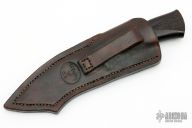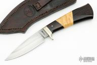 This Hunter by Master Smith Ed Caffrey features a hand rub satin finished blade with hamon, .205" blade stock and 1.118" blade depth, hidden tang construction. The handle has a fluted nickel silver guard, marple burl and carved cocobolo grip with black spacers. Comes with a hand tooled brown leather sheath. Excellent condition.