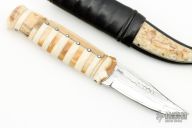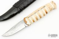 This knife by Roger Bergh features a Damascus blade with .154" blade stock and .949" blade depth, hidden tang construction. The handle is made from multiple pieces of walrus ivory with inset diamonds. Comes with a black leather and buffalo horn sheath with walrus ivory inlay. Excellent condition.