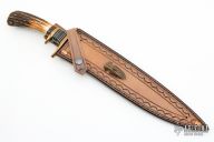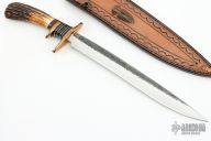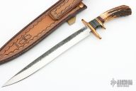 This Sub-Hilt Fighter by James Behring features a satin finished and hammer marked blade with false top edge, .260" blade stock and 1.137" blade depth, hidden tang construction. The handle has a copper guard and sub-hilt, stag grip with copper pin, black/white/copper/red spacers. Comes with a hand tooled brown leather sheath with belt loop, stag overlay and copper arrowhead rivets by Roger "Mudbone" Jones. Excellent condition.