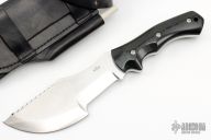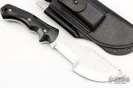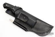 This WSK by Juergen Schanz features a satin finished blade with sawteeth on blade spine, full tang construction with .250" blade stock and 2.533" blade depth. The handle has black linen micarta scales with a lanyard hole at the butt. Includes a black leather sheath with belt loop and sharpening rod. New from maker!
